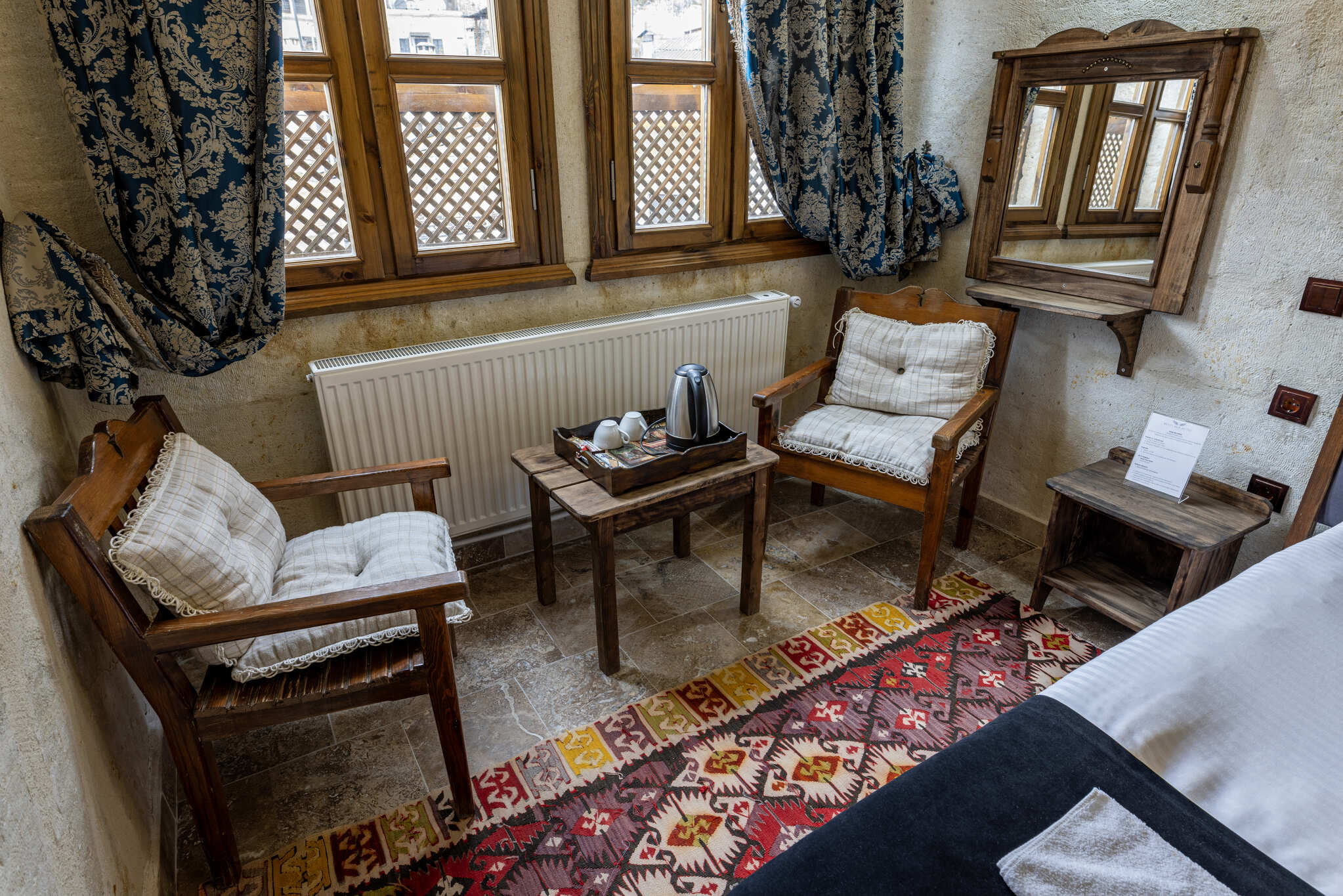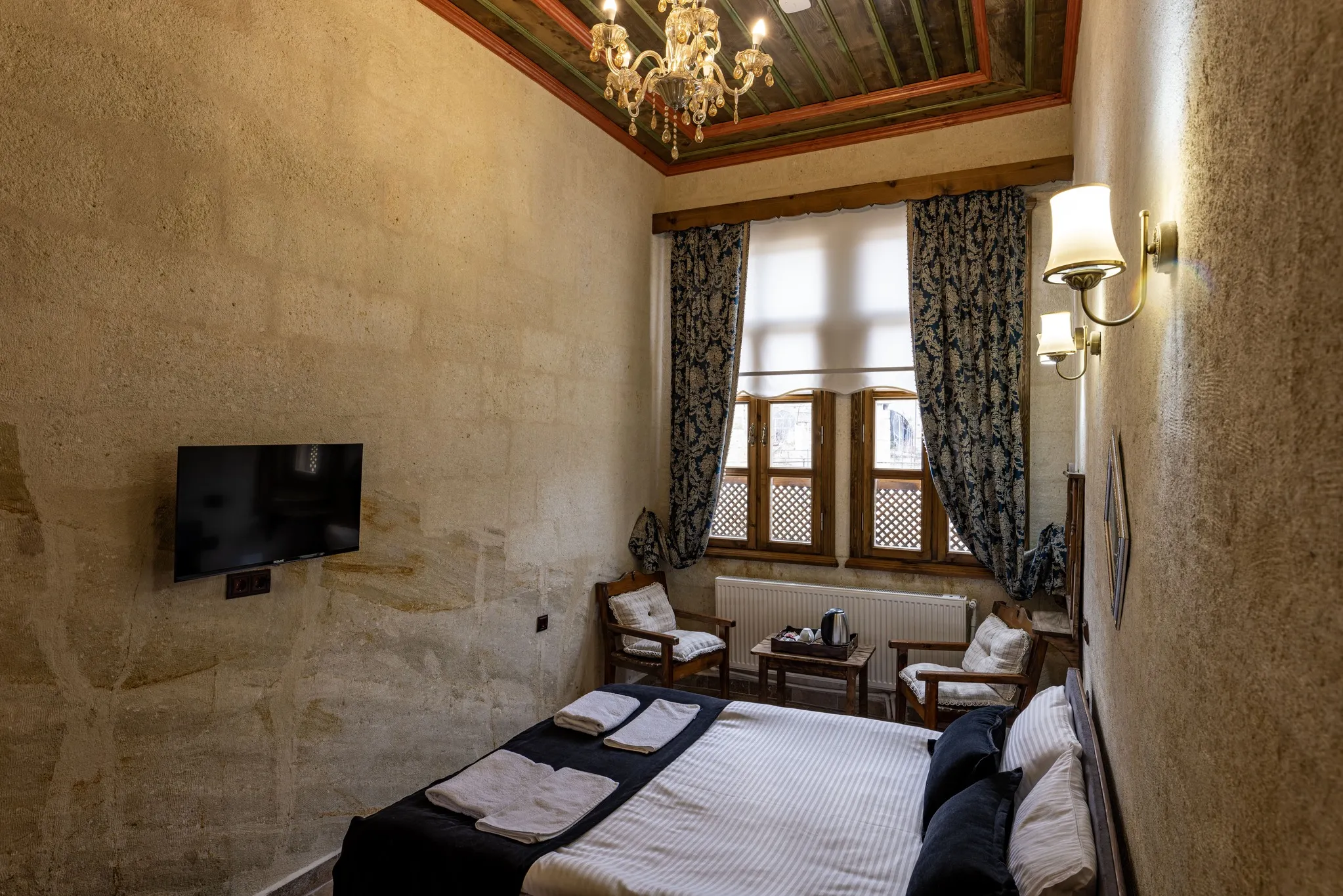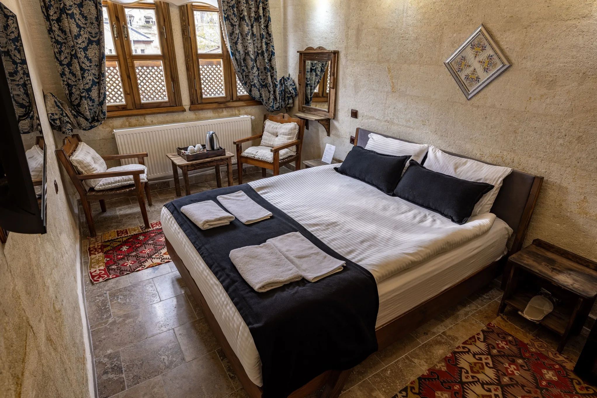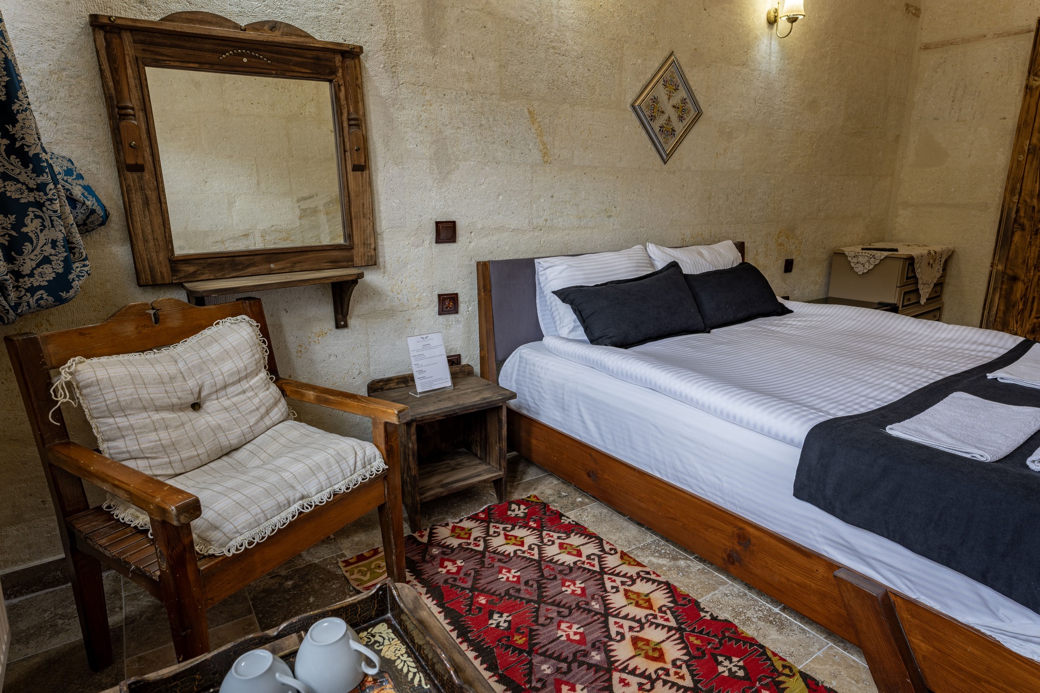 Oda tasarımı, Kapadokya’nın kaya ev konseptini yansıtırken, modern yaşamın tüm gereksinimlerini karşılar. Taş dokulu iç mekan, doğal ve sıcak bir atmosfer yaratırken, misafirlere hem romantik hem de huzurlu bir konaklama deneyimi sunar. Her detay, misafirin konforunu ve Kapadokya’nın büyüleyici ruhunu maksimum şekilde hissetmesini sağlamak üzere özenle tasarlanmıştır.