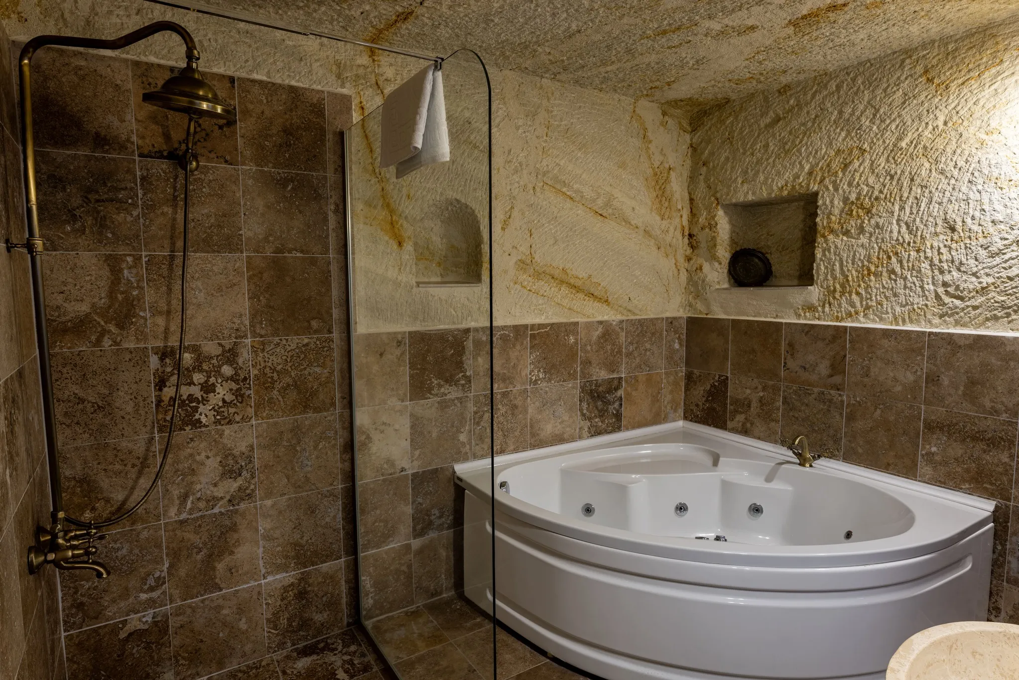 Odanın en dikkat çekici özelliği özel jakuzi alanıdır. Yumuşak ışıklandırma ve doğal kaya dokusu ile çevrili jakuzi, günün yorgunluğunu atmanız, rahatlamanız ve romantik bir atmosferin keyfini çıkarmanız için ideal bir ortam sunar. Bu alan, aynı zamanda odanın özel ve samimi havasını güçlendirir.