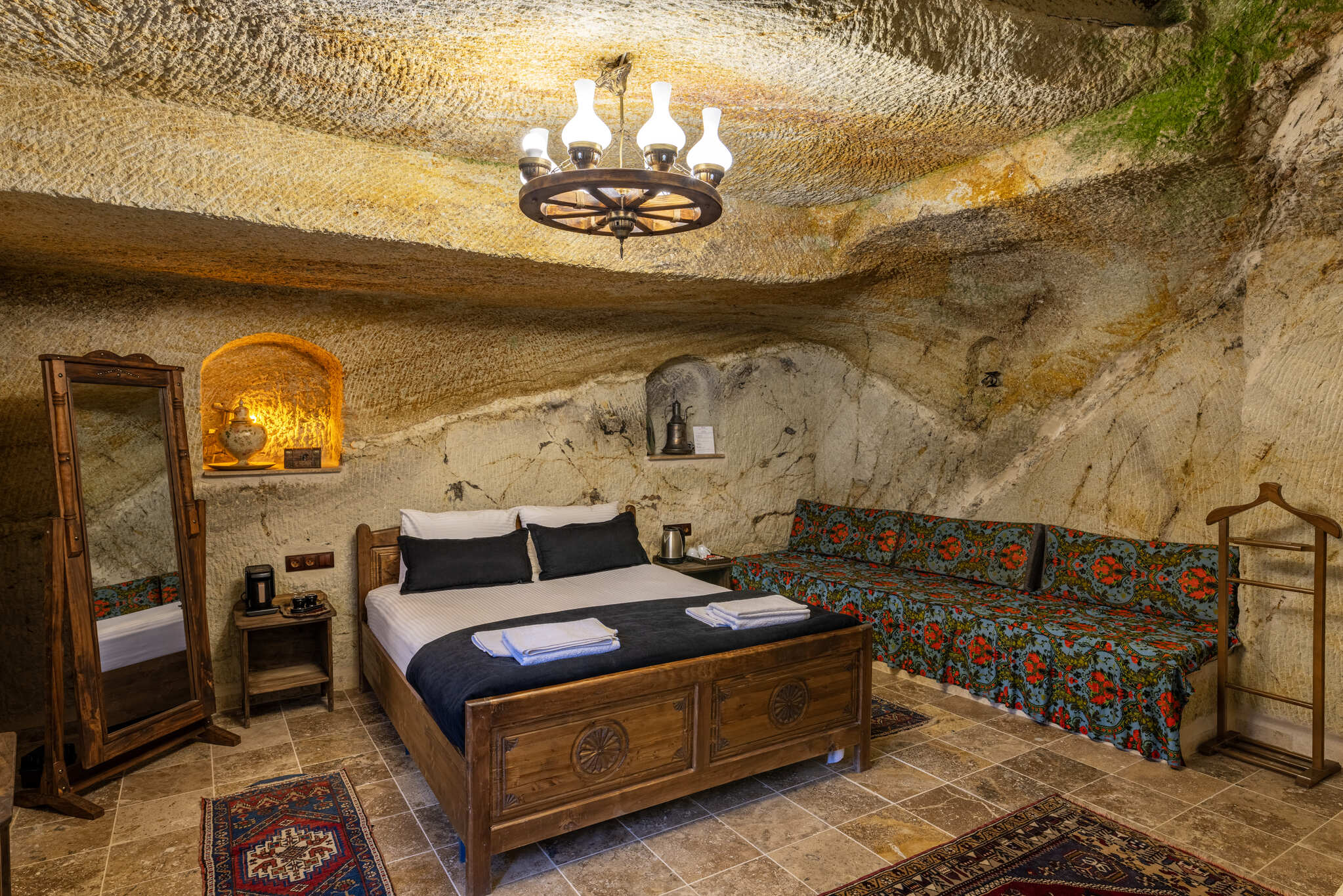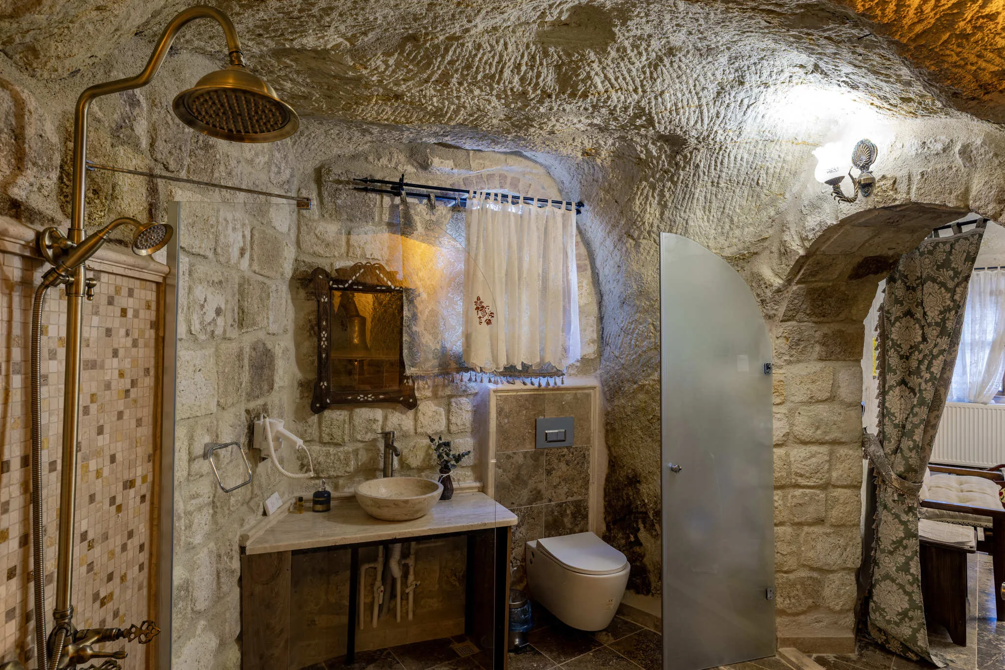 Odanın en dikkat çekici özelliği özel jakuzi alanıdır. Yumuşak ışıklandırma ve doğal kaya dokusuyla çevrelenen jakuzi, günün yorgunluğunu atmanız, rahatlamanız ve romantik bir atmosferin keyfini çıkarmanız için ideal bir ortam sunar. Jakuzi, odanın huzurlu ve özel atmosferini tamamlayarak, Kapadokya tatilinizi unutulmaz kılar.