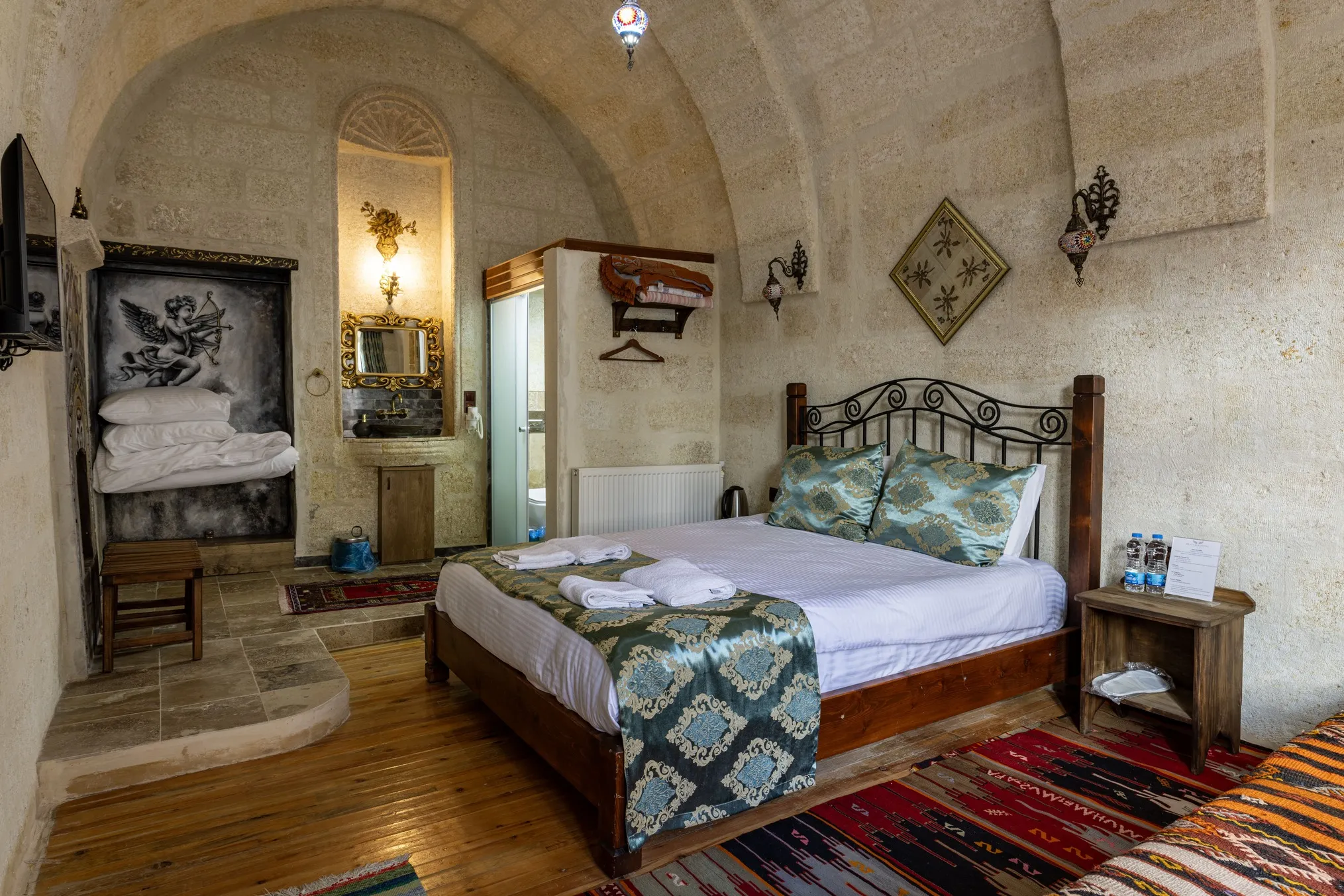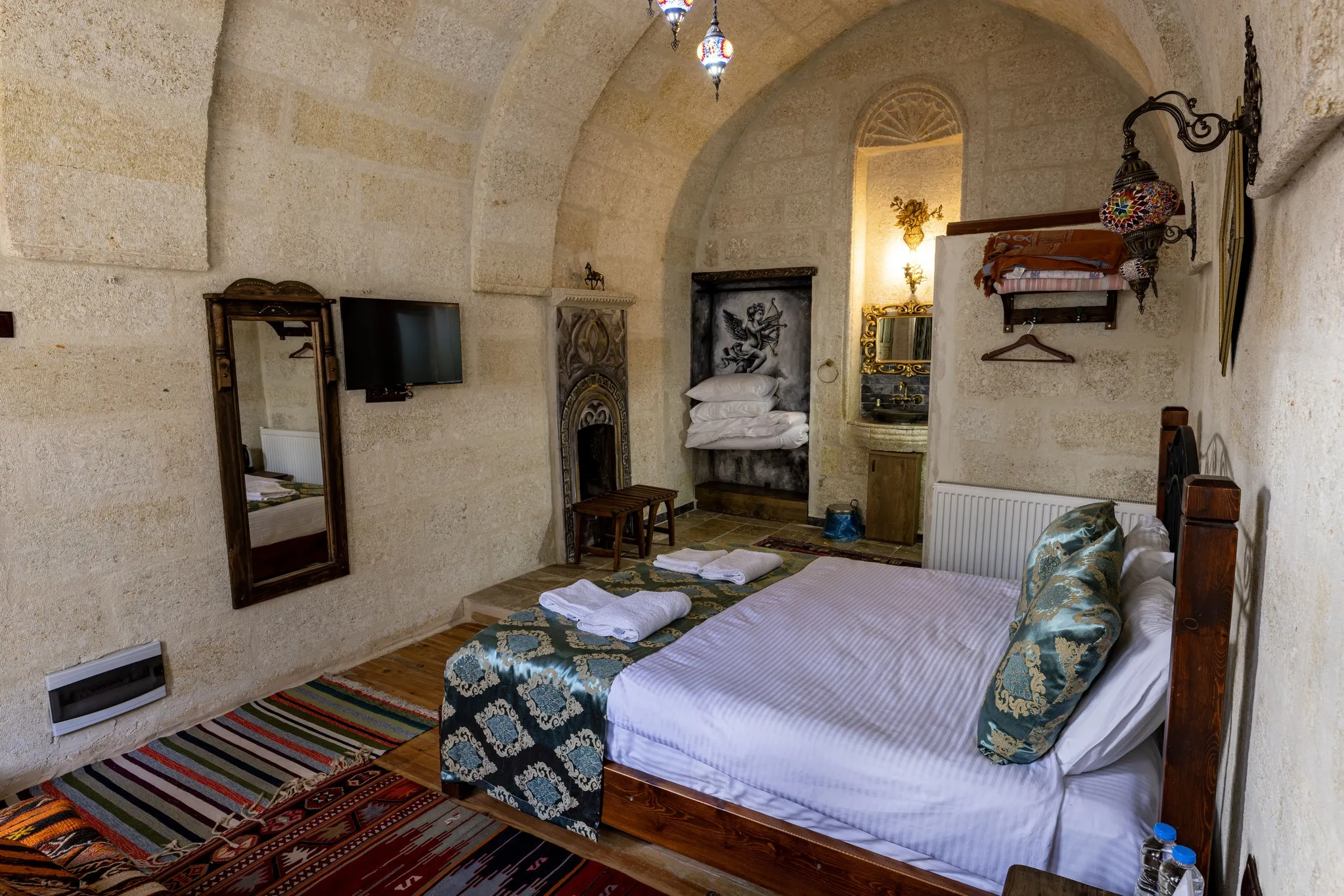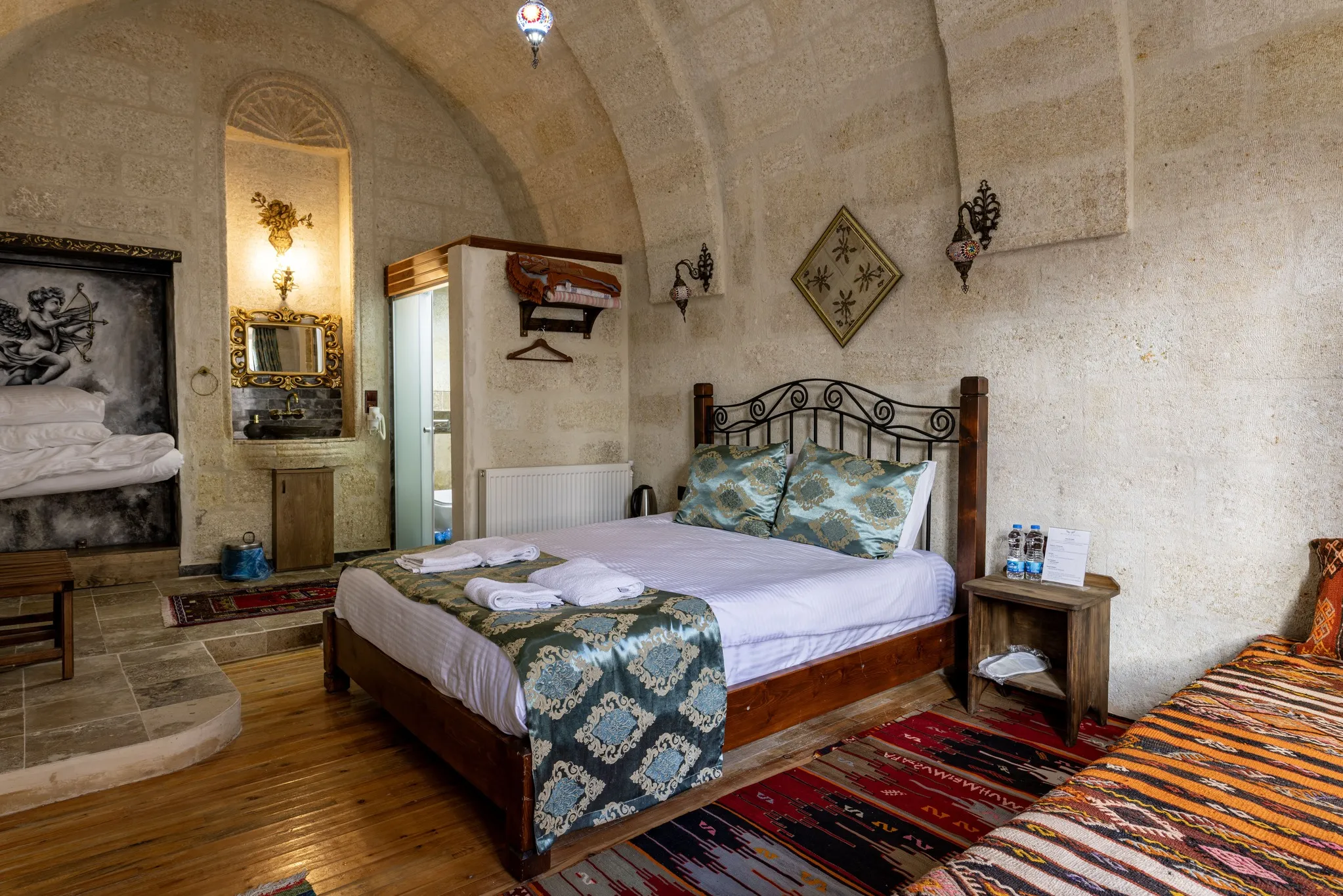 İç mekânın taş dokusu, Kapadokya’nın eşsiz kaya evlerinin otantik ruhunu yansıtır ve misafirlere hem tarih hem de doğa ile iç içe bir konaklama deneyimi sunar. Oda, sakinliği ve mahremiyeti ile çiftler için romantik bir atmosfer yaratırken, ayrı yatak seçeneği ile esneklik sağlar.