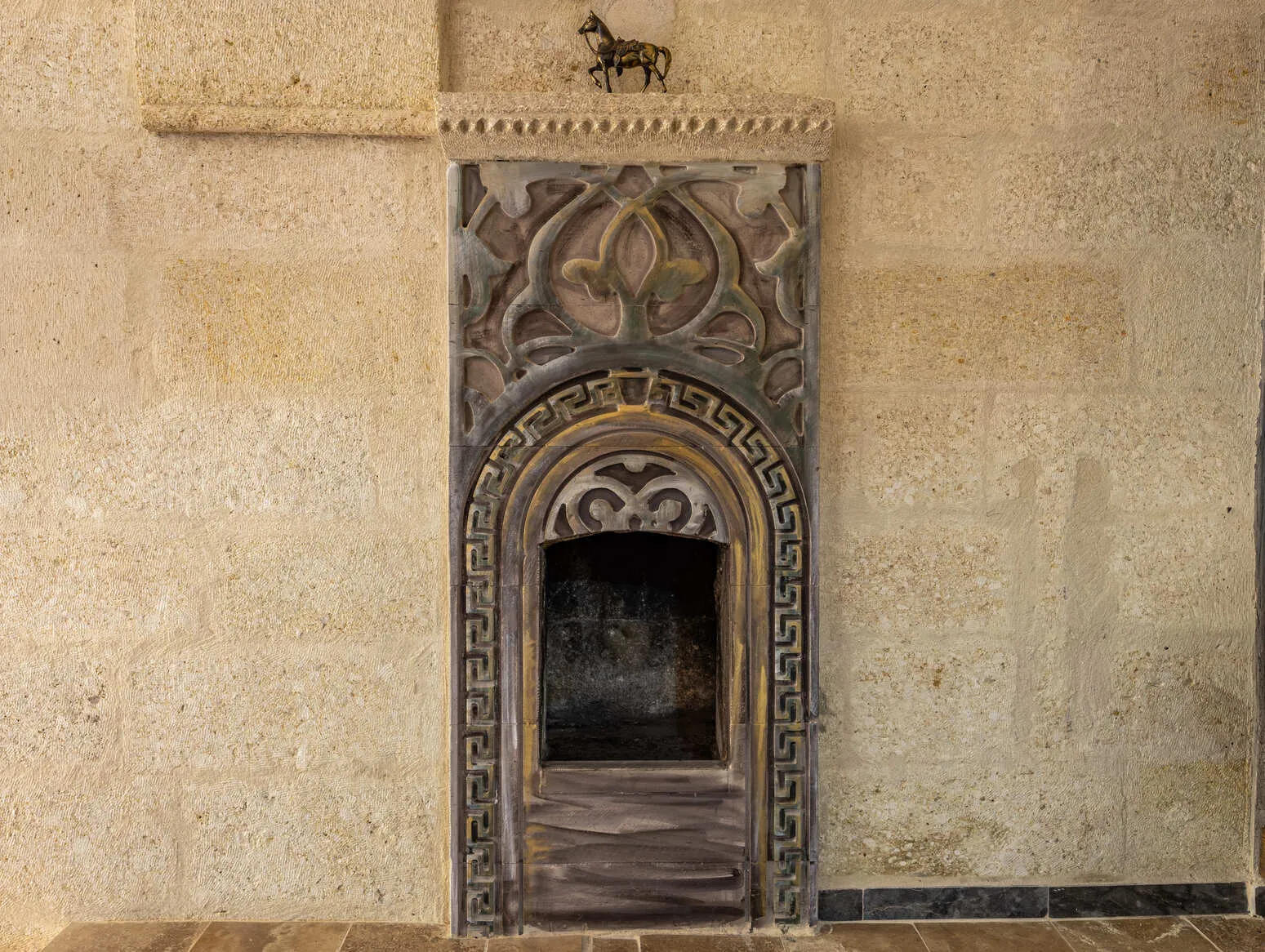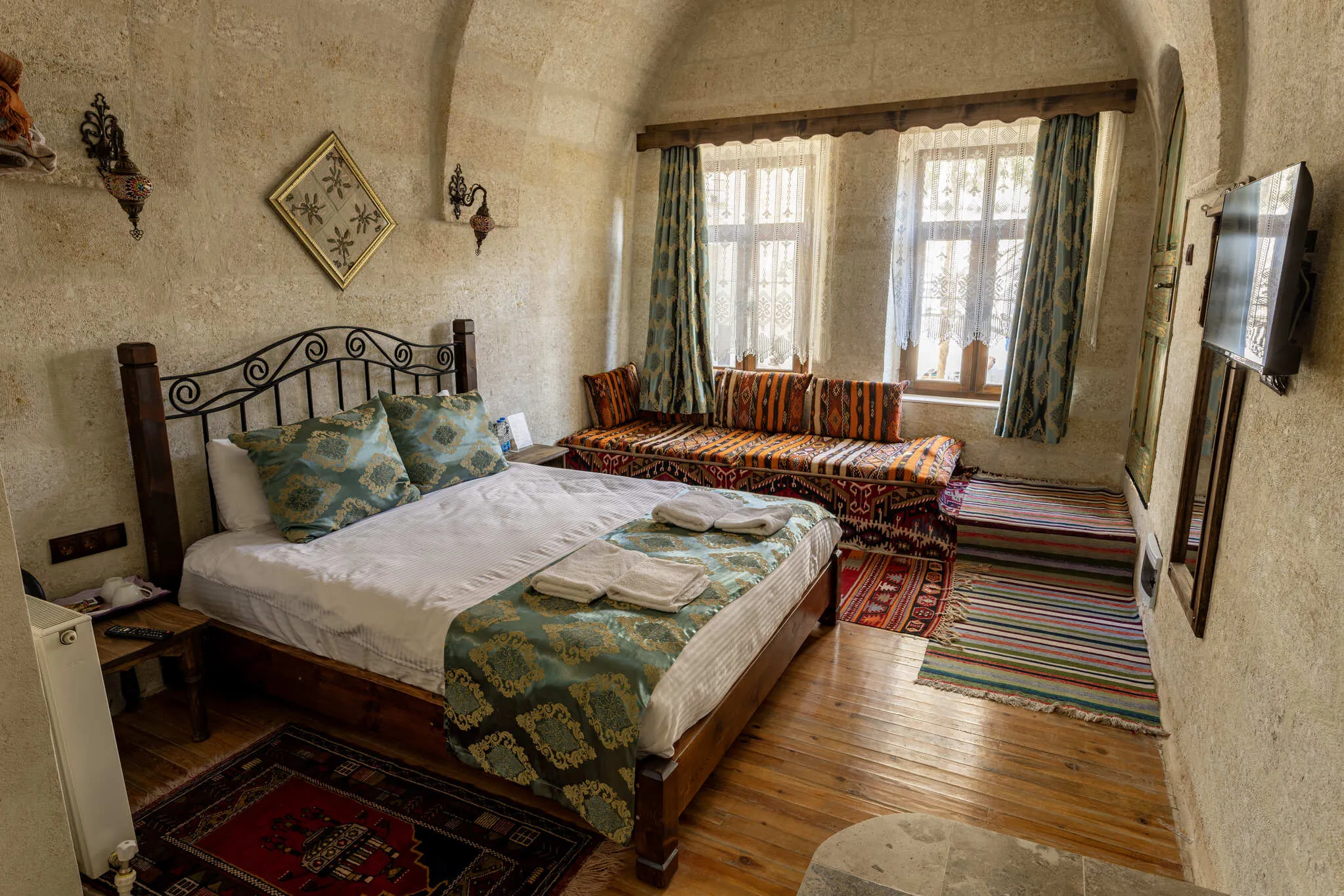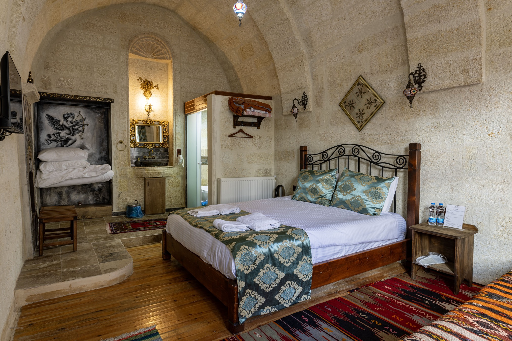 İç mekânın taş dokusu, Kapadokya’nın eşsiz kaya evlerinin otantik ruhunu yansıtır ve misafirlere hem tarih hem de doğa ile iç içe bir konaklama deneyimi sunar. Oda, sakinliği ve mahremiyeti ile çiftler için romantik bir atmosfer yaratırken, ayrı yatak seçeneği ile esneklik sağlar.