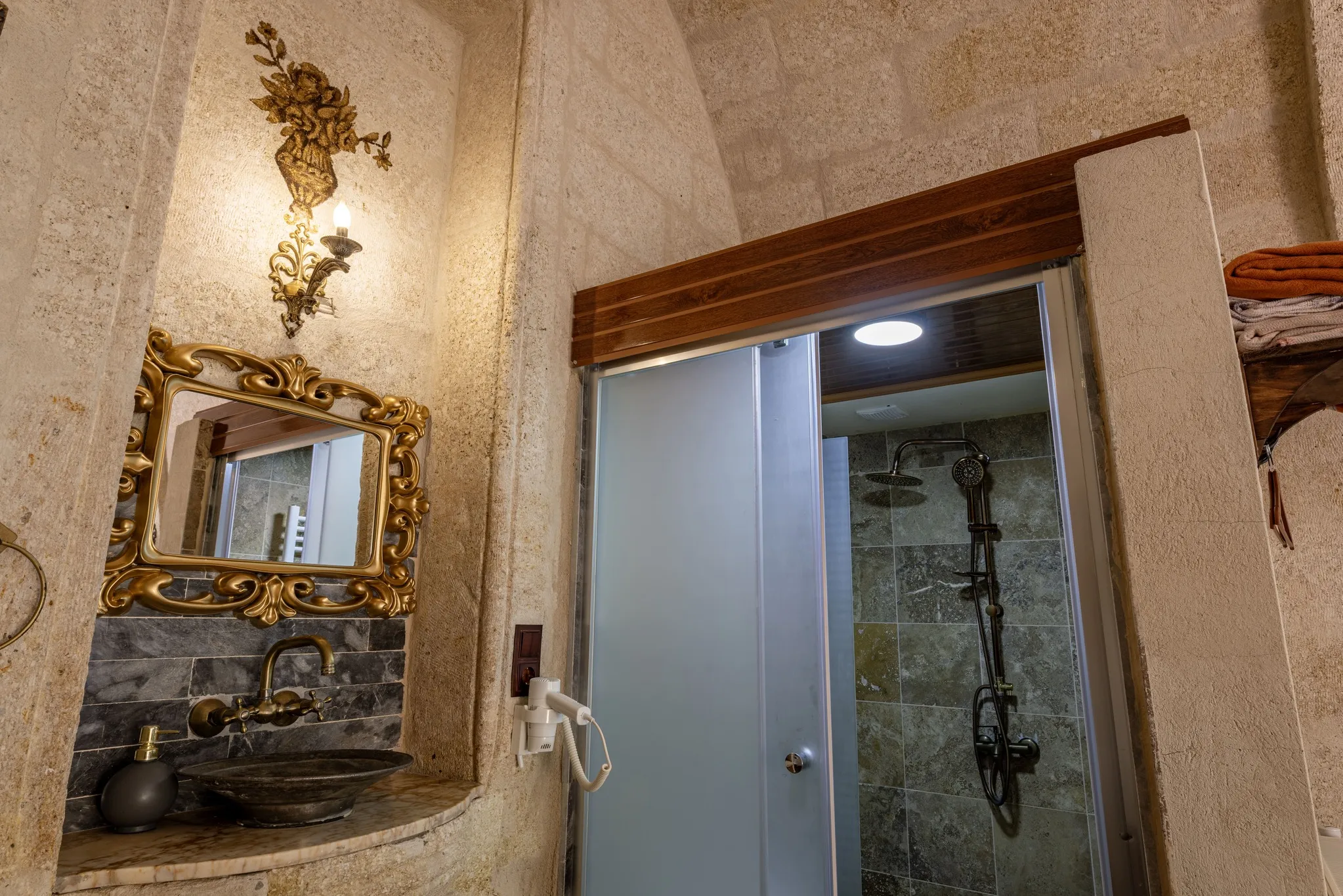 Odanın en dikkat çekici özelliği özel jakuzidir. Günün yorgunluğunu atmak, romantik anları paylaşmak veya sadece Kapadokya’nın eşsiz manzarası eşliğinde rahatlamak için mükemmel bir alan sağlar. Yumuşak ışıklandırma, doğal taş mimarisi ve zarif dekoratif detaylar, jakuzi alanını hem huzurlu hem de romantik bir sığınak hâline getirir.