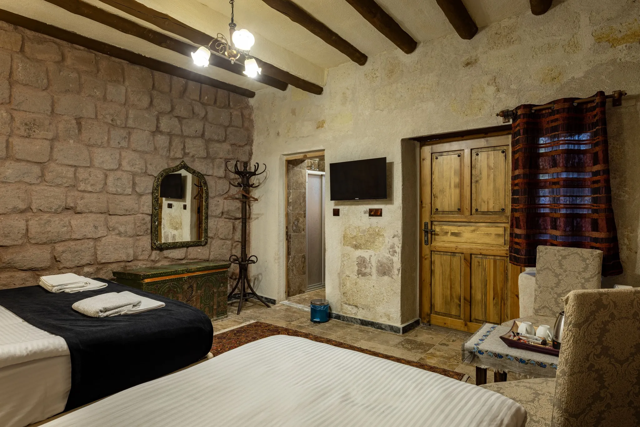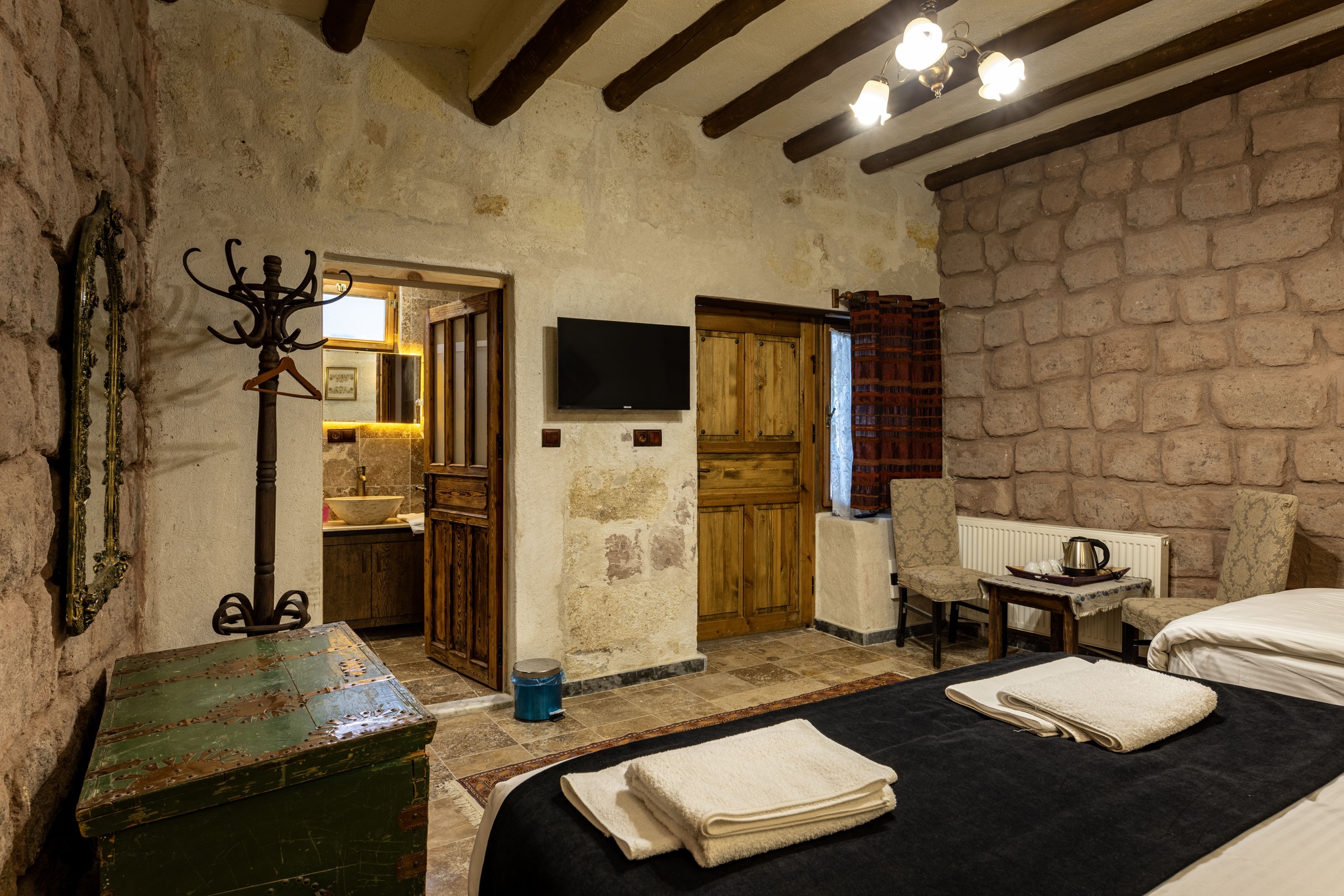 Odanın dekorasyonu, otelin kaya suit konseptini yansıtacak şekilde özenle tasarlanmıştır. Doğal taş dokusu, el yapımı detaylar ve sıcak renk tonları, misafirlere hem otantik hem de modern bir ortam sunar. Gün boyu Keyfi Ala’nın sunduğu 24 saat oda servisi sayesinde, dilediğiniz saatte kahvaltı, hafif atıştırmalıklar veya özel siparişlerle konforunuz tamamlanır.
